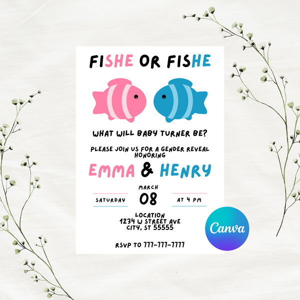 Editable Pink And Blue Fish Themed Gender Reveal Party Invitation Template 5x7
