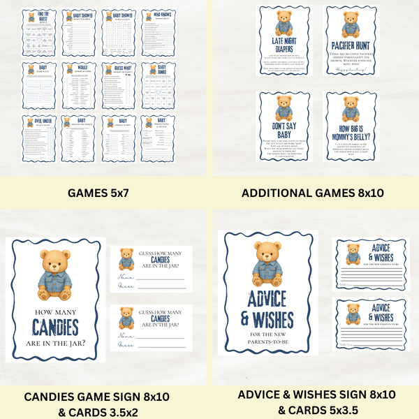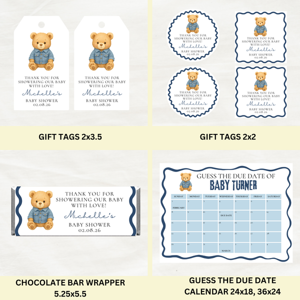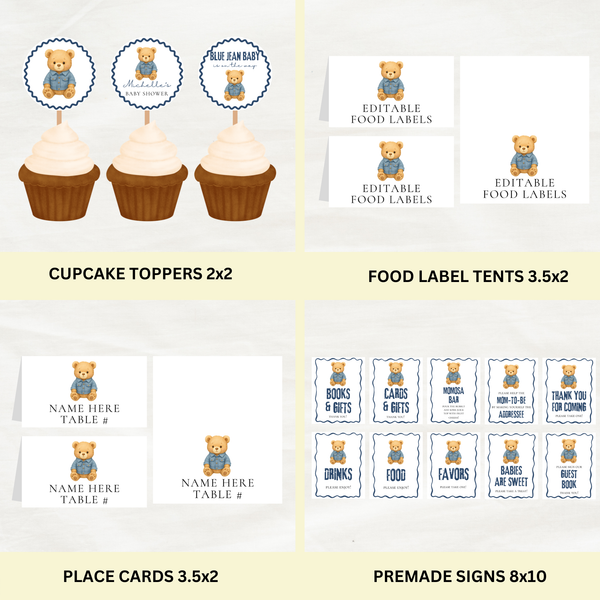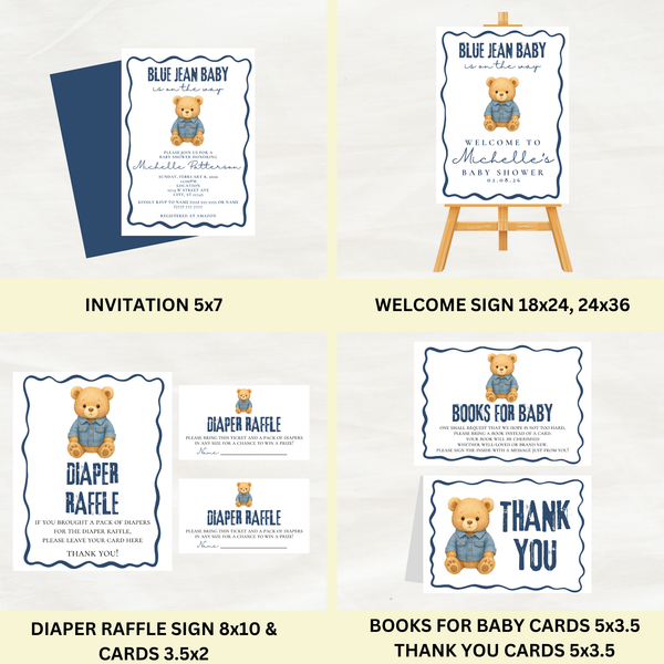 Editable Bear Blue Jean Baby Is On the Way Baby Shower Bundle Set | Instant Download | Edit With Canva