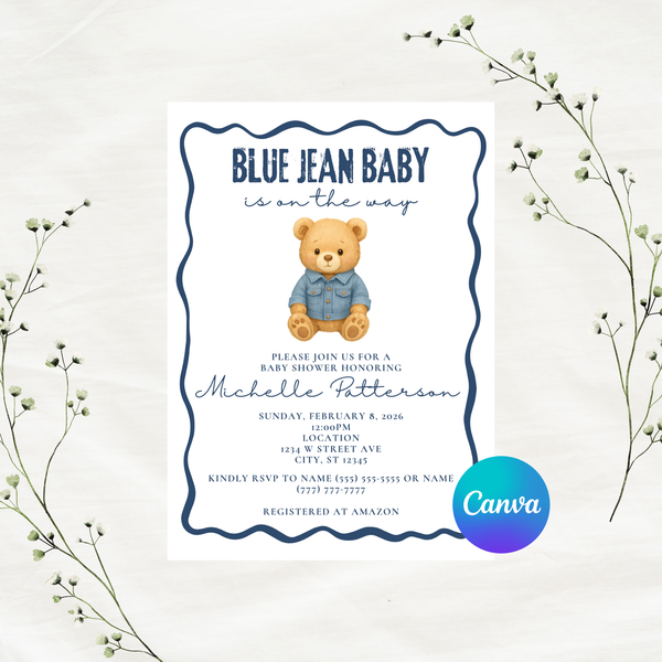 Editable Bear Blue Jean Baby Is On The Way Baby Shower Invitation Template | Instant Download | Canva Template | 5x7